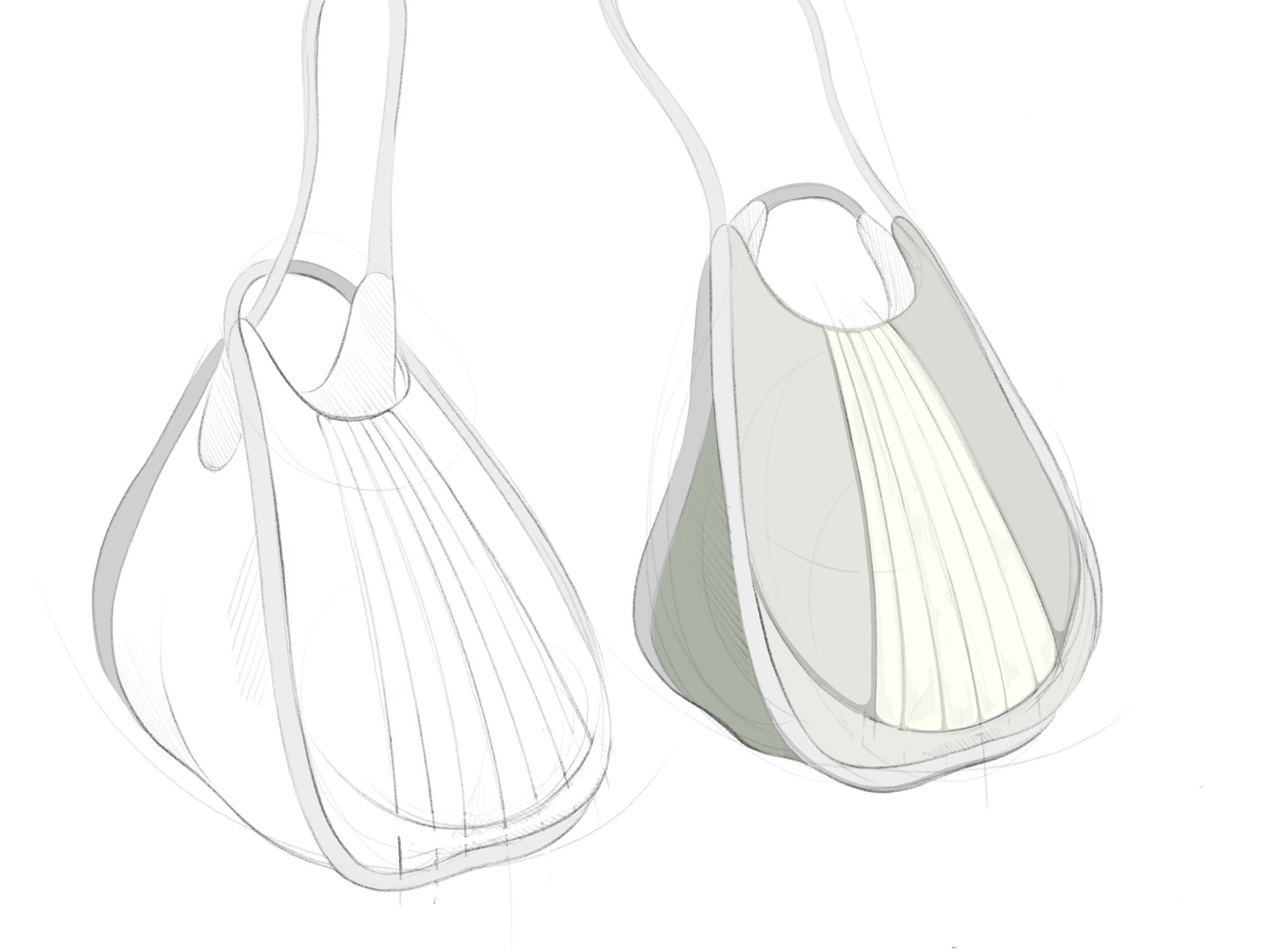 The underbellies of mushrooms, the pleats of ginkgo leaves, and the texture of tree bark strongly influenced the visual language of my bag, informing both its form and color palette. In my initial sketches, I explored the idea of transformation, experimenting with how the bag might shift in structure. From the outset, I wanted it to have a relaxed form as I developed the concept of biophilia, playing with texture and possible color schemes.
