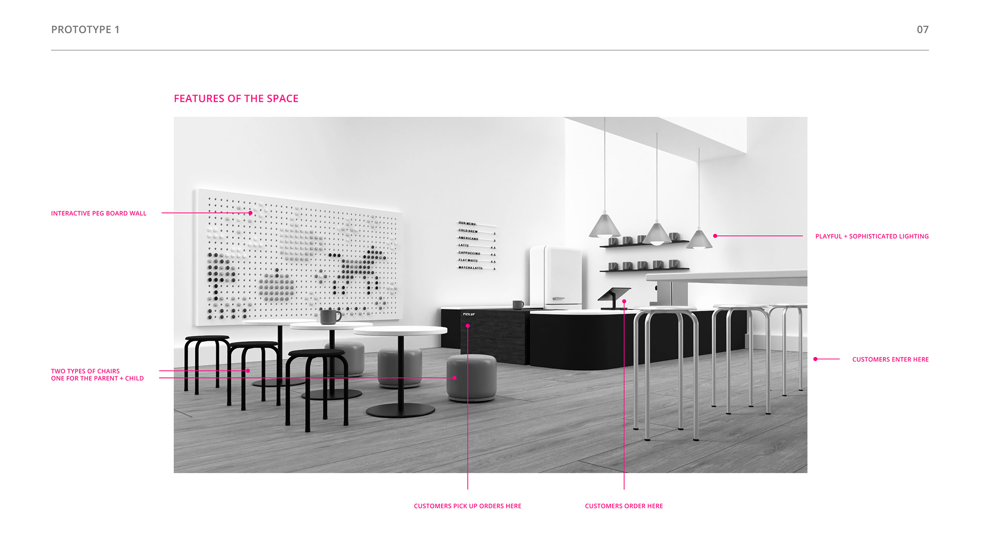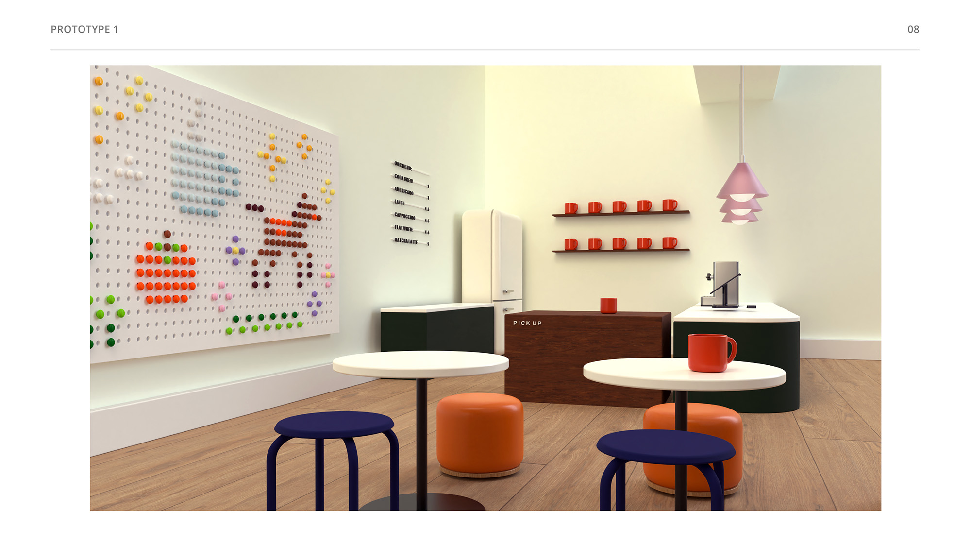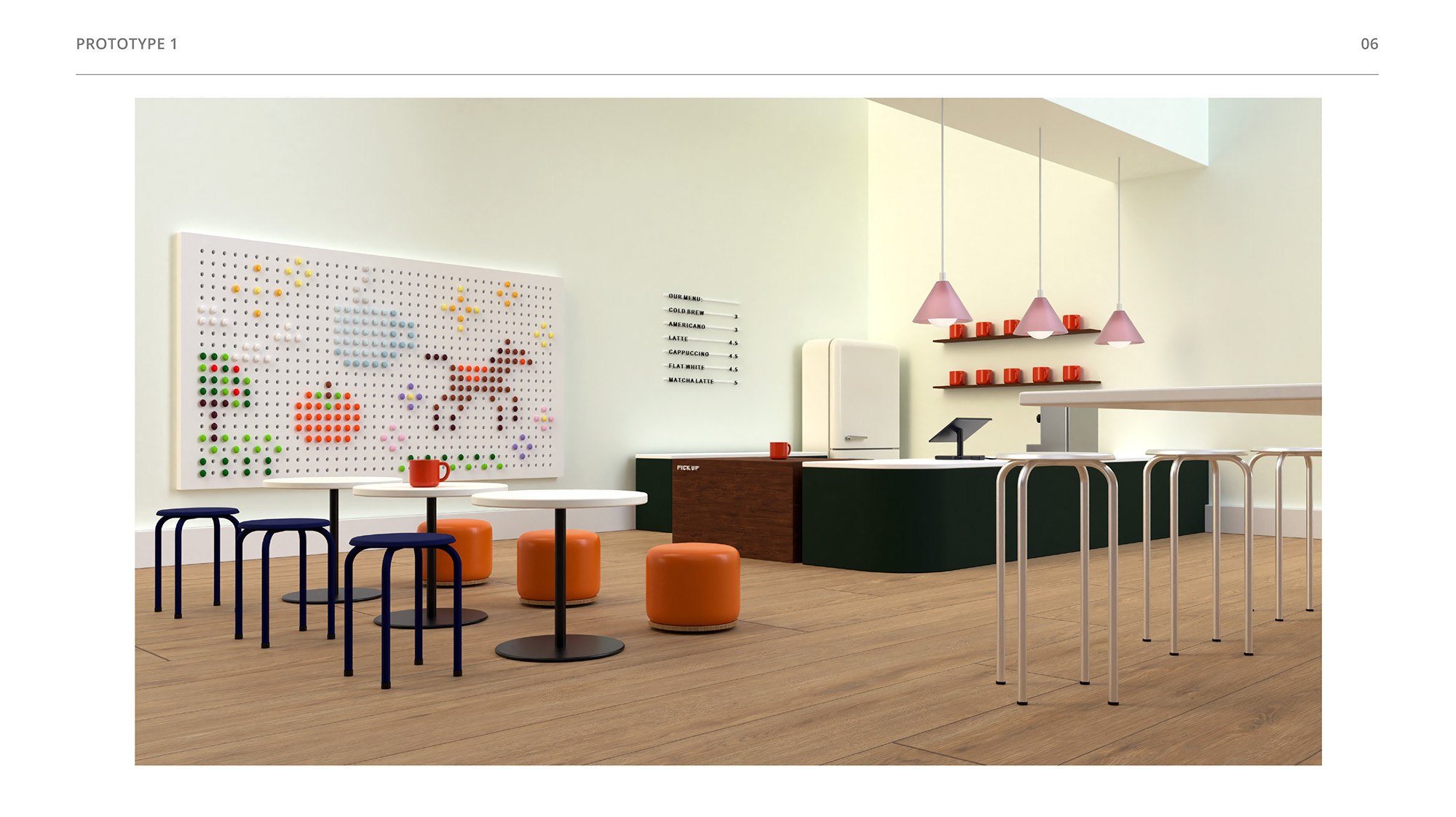 Inspiration for this children's cafe concept came from my mom’s friend, who owns a “Kid’s Craft Cafe” in Seoul, South Korea. While parents drink coffee and socialize, kids are kept busy and stimulated, making various kinds of art projects. This cafe concept sounded so playful to me, so I envisioned my own personal take.