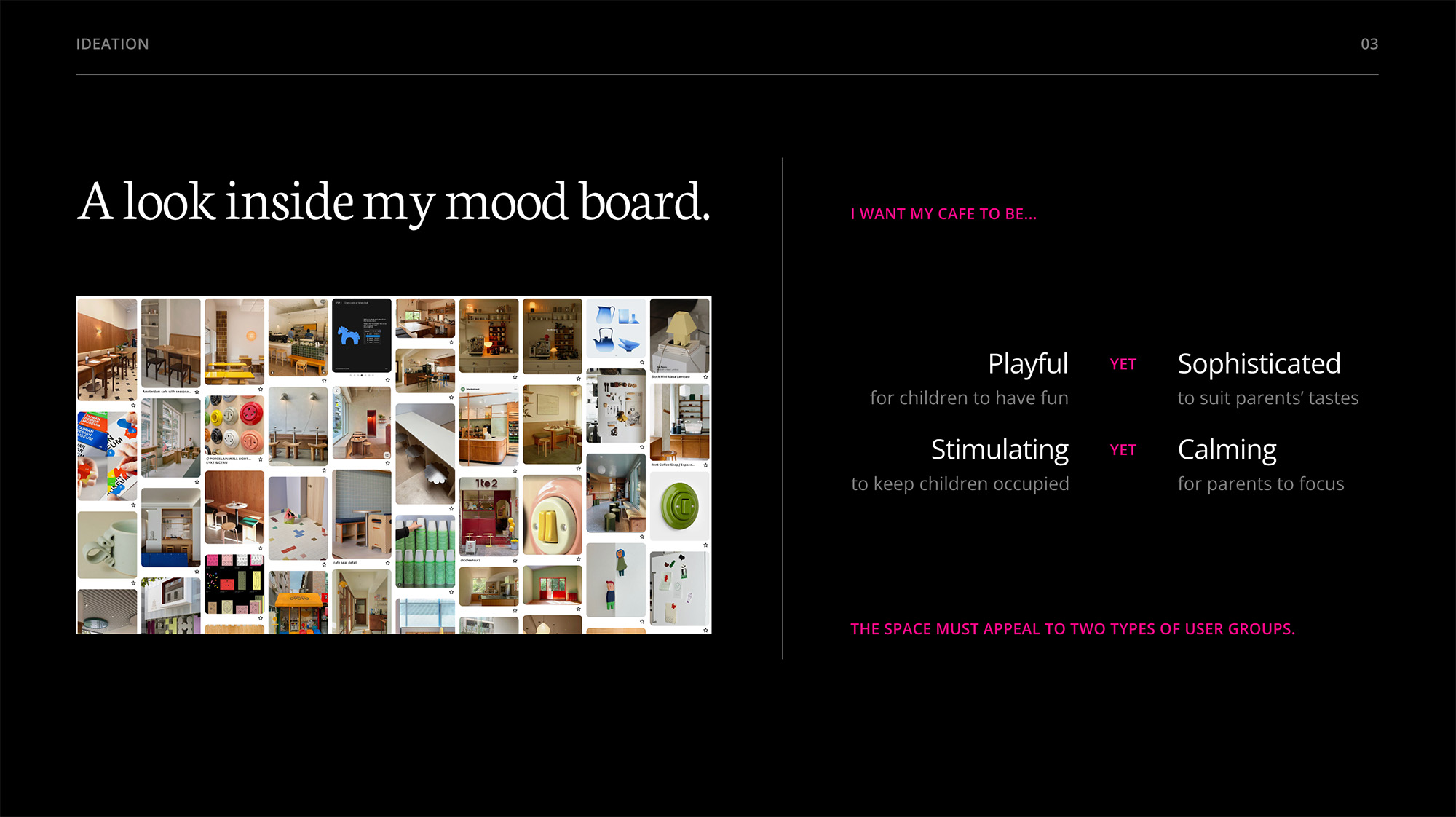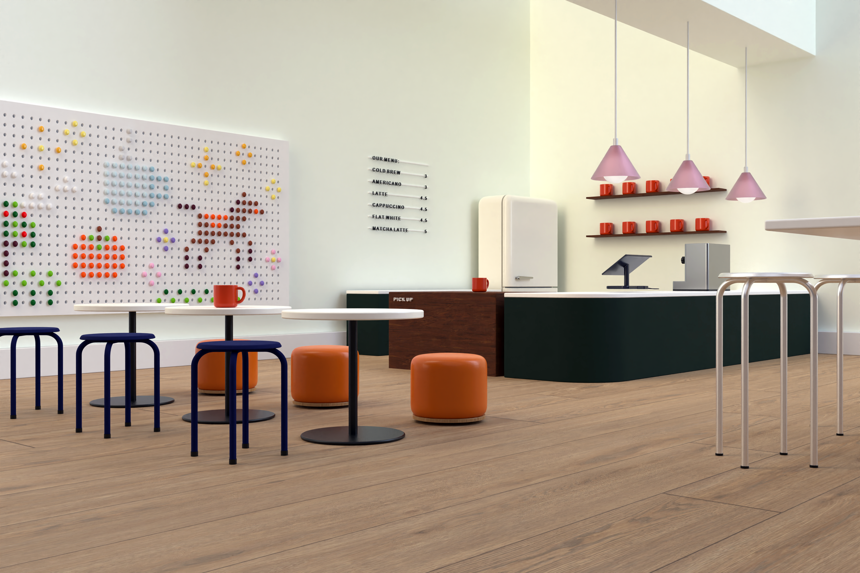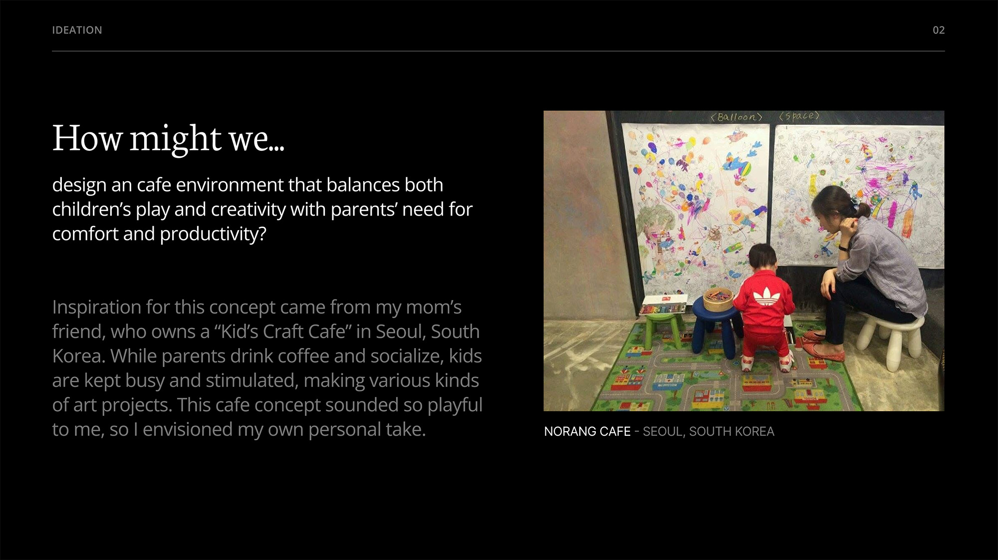 Inspiration for this children's cafe concept came from my mom’s friend, who owns a “Kid’s Craft Cafe” in Seoul, South Korea. While parents drink coffee and socialize, kids are kept busy and stimulated, making various kinds of art projects. This cafe concept sounded so playful to me, so I envisioned my own personal take.