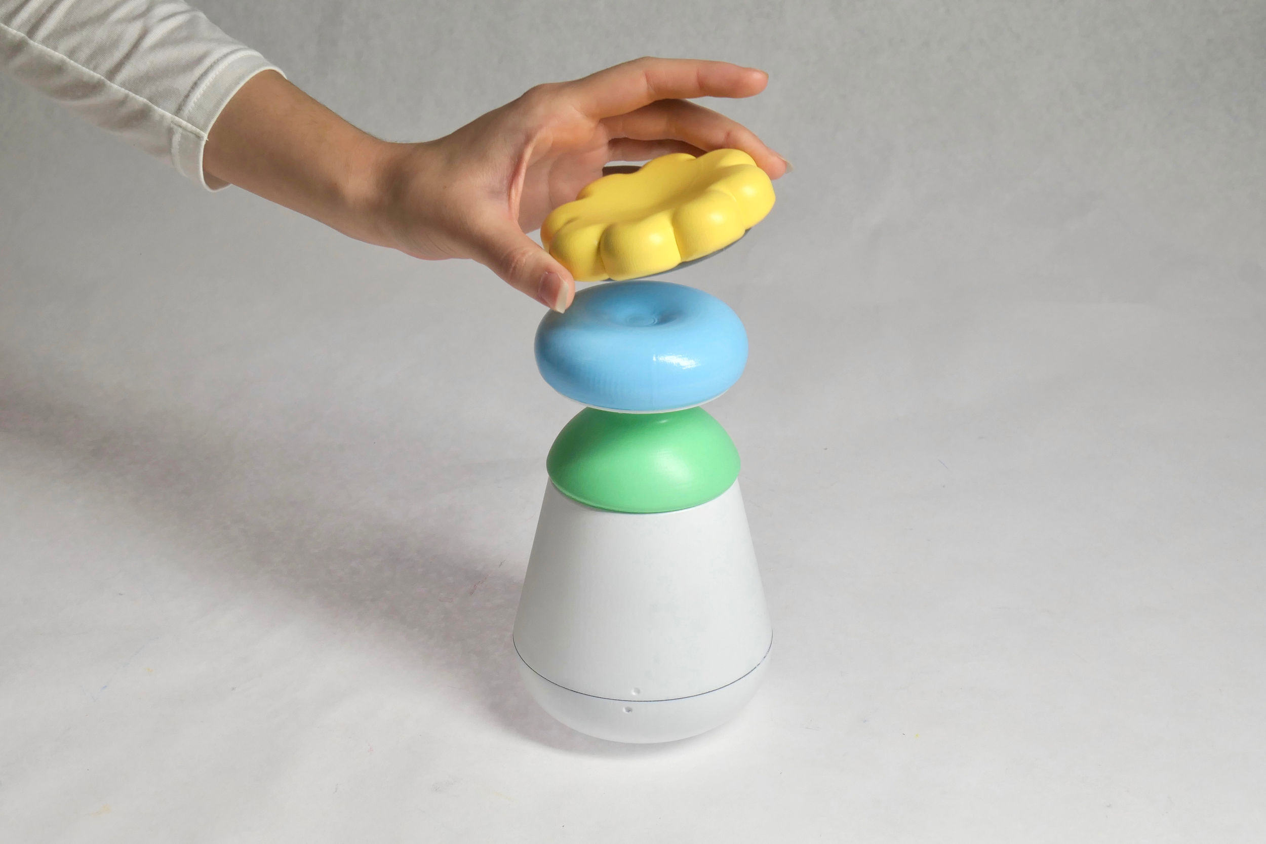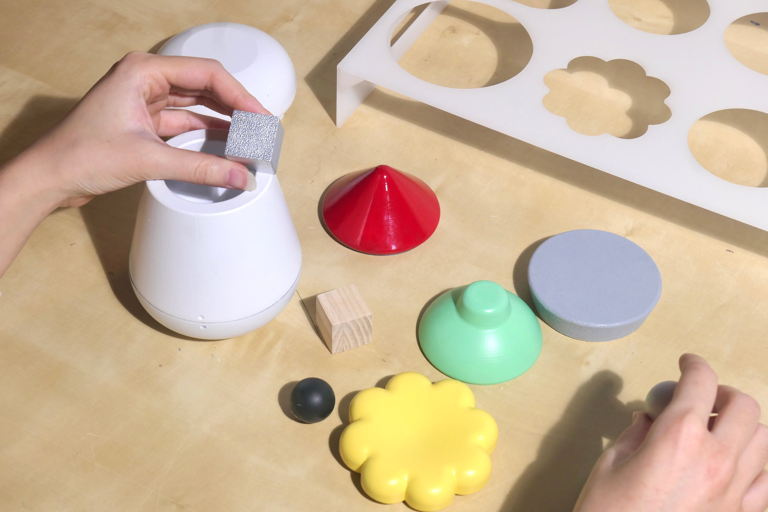 Each shape was 3-D printed, coated with acrylic paint, and finished with a spray paint gloss or a gel-medium finish. Variation in weight were created using steel car weights.