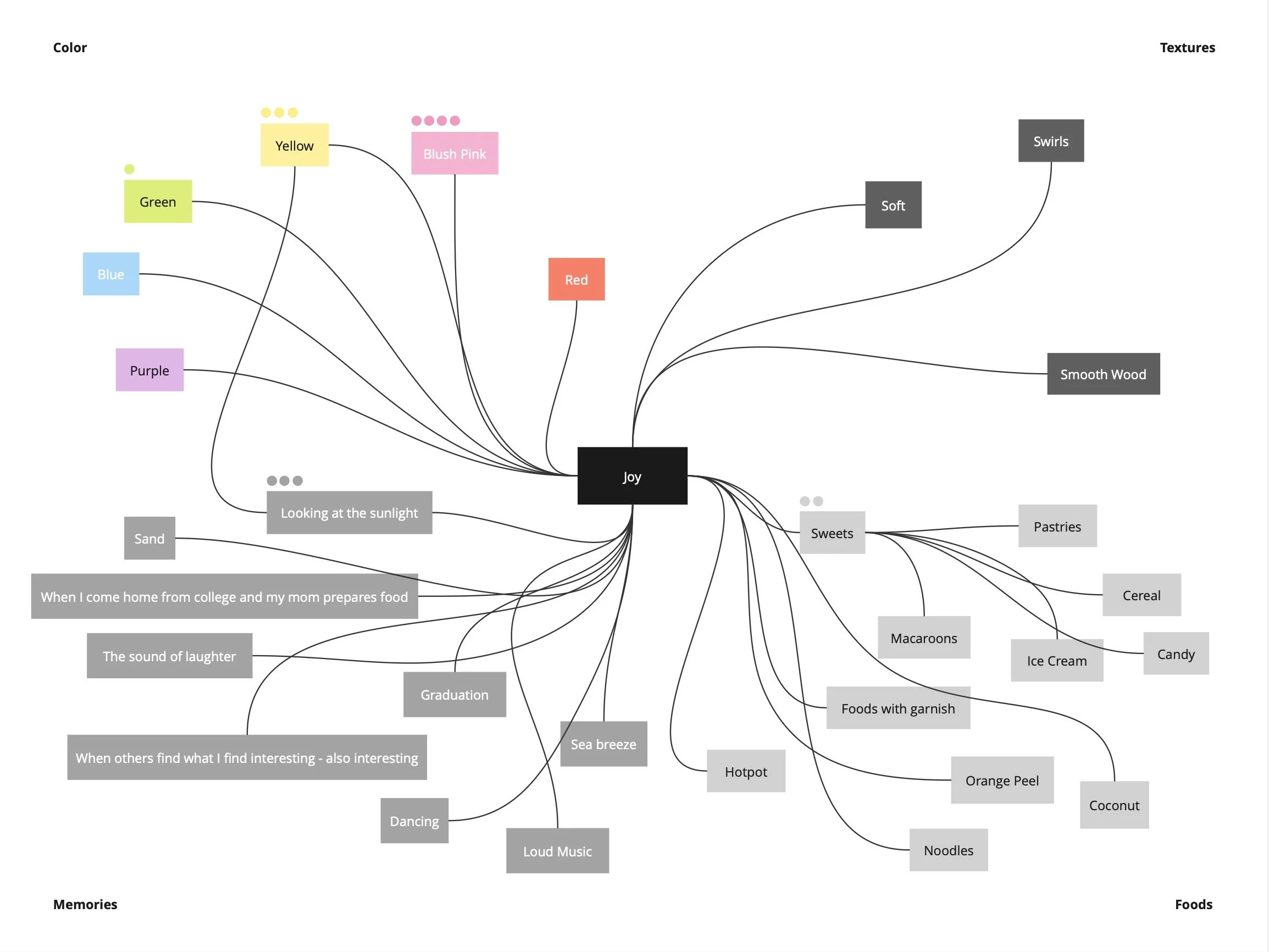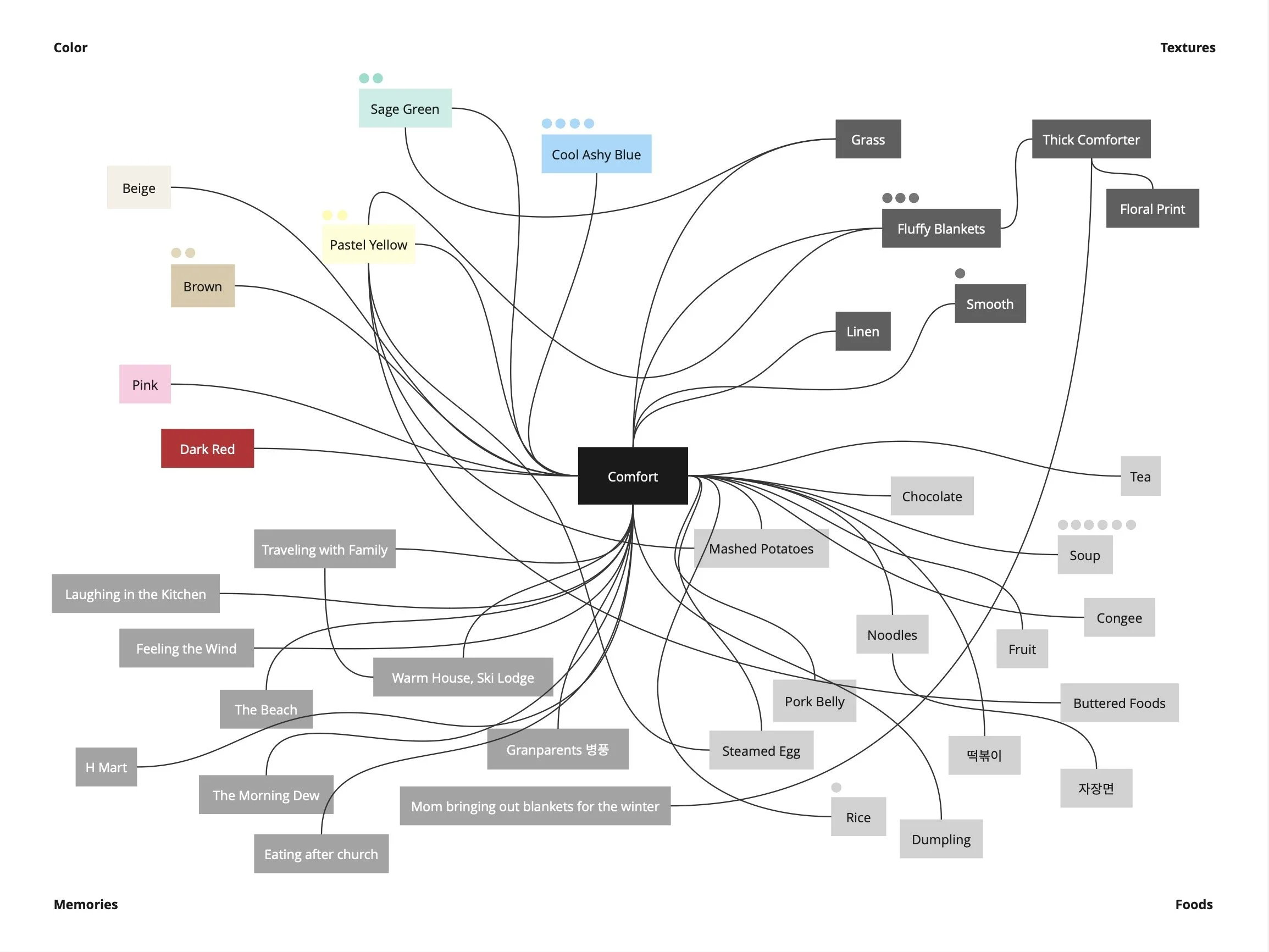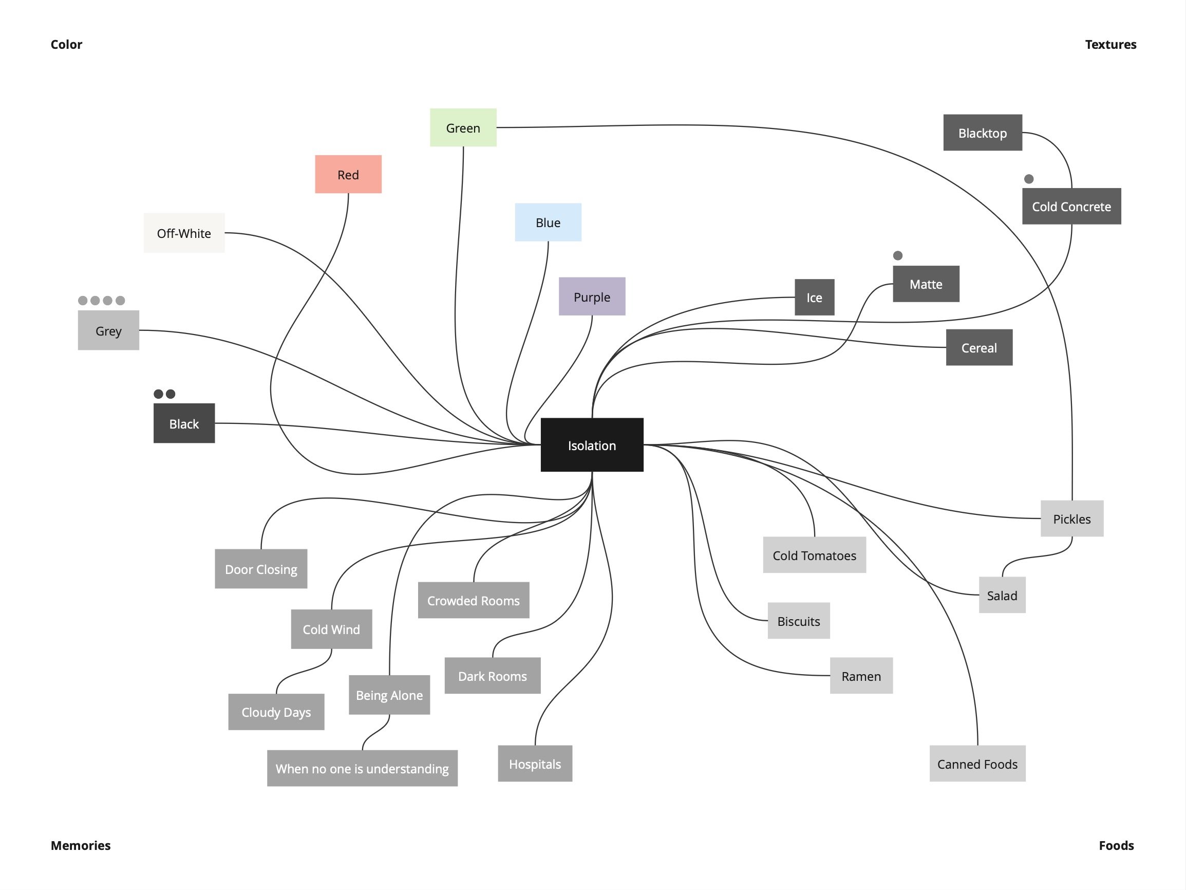 In the survey I asked participants which colors, textures, memories, and foods they associated with the emotions of comfort, fear, frustration, and isolation. Data collected from the survey was then compiled and organized using a MIRO board where I drew connections between similar ideas and tallied the most common responses.