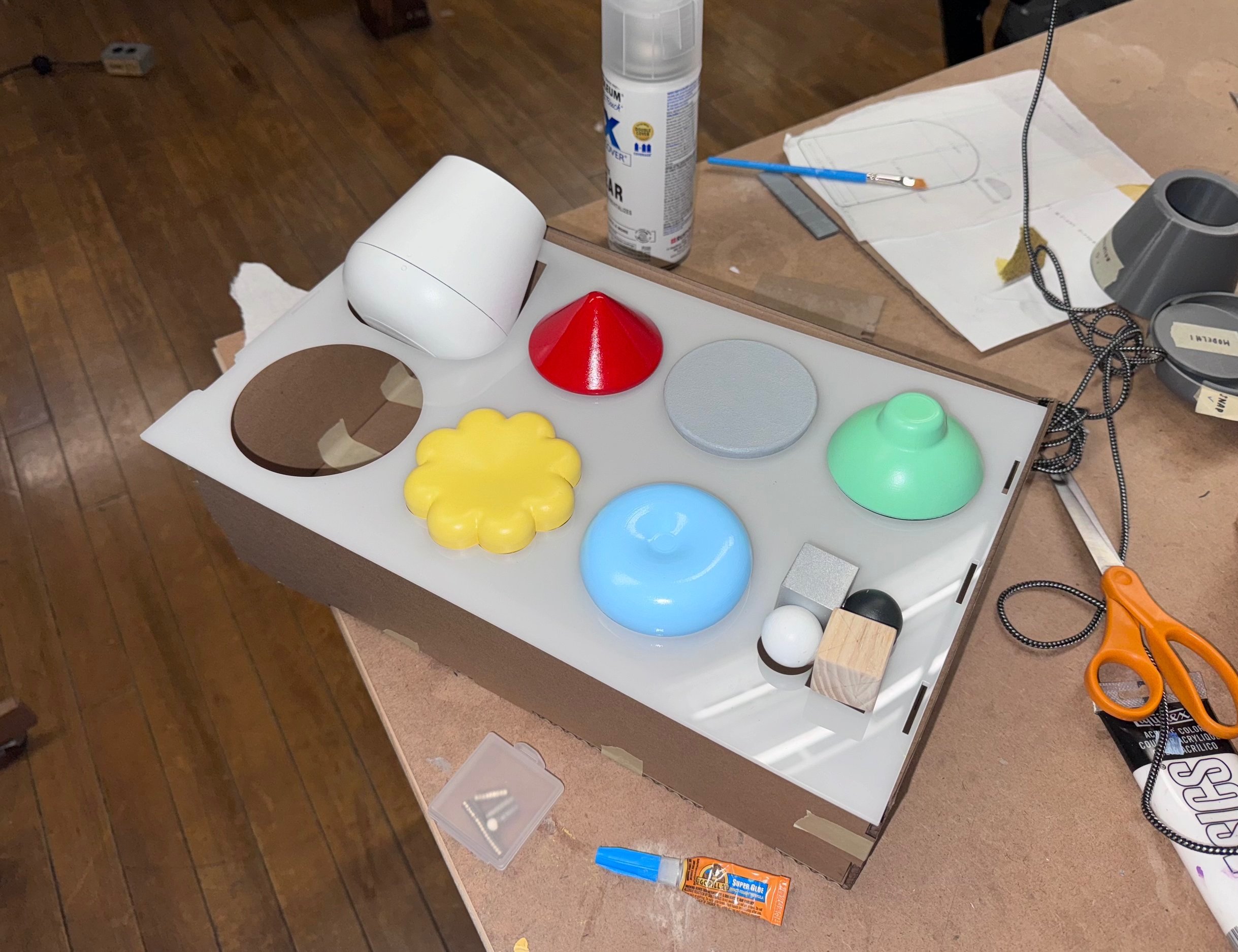 I first made a lo-fi model of the tray using cardboard first to make sure all the measurements were correct. The the final tray holding the items is made from acrylic to simplify sanitization between therapy sessions.