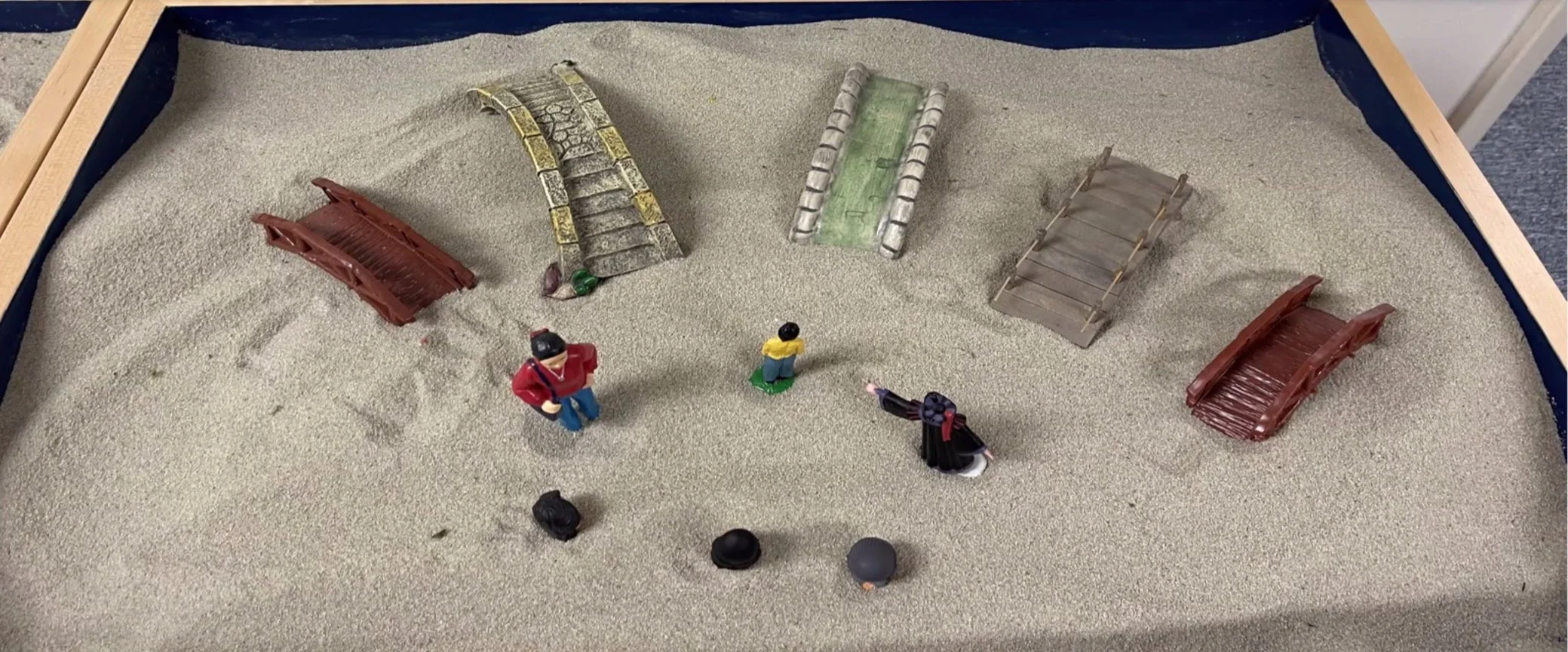 Below are examples of a sand play therapy tray from one of Mrs. Machado-Jenkins clients. She has an extensive collection of symbols and 2 sand trays (one dry/one wet) where clients are invited to “play” and organzine their thoughts and feelings.